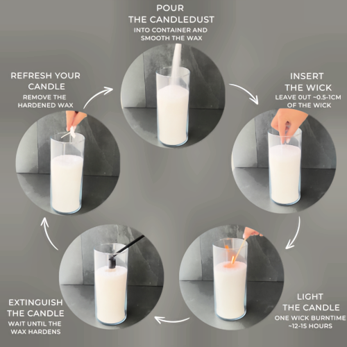 Environmentally friendly scented powder candles. Candledust is a family-owned company from Estonia specializing in handmade candles. What started as a passion for creating beautiful and environmentally friendly candles has become a revolution. While exploring different candle technologies, the creators of Candledust stumbled upon the idea of scented powder candles, in which they became pioneers. Candledust is dedicated to making candles in the most environmentally friendly way possible. The ingredients used in their candles are certified as fully recyclable and reusable, making them a favourite among candle enthusiasts. One thing that sets Candledust apart is the use of vegetable wax. This wax burns cleanly without producing soot or smoke, making it a healthier and more sustainable choice. How to use the Candledust? 1. Find a suitable container. 2. Pour the Candledust into the container. 3. Place the candlewick in the powder, light it, and enjoy! scented candles / something new / good for gifting / powdered candles / environmentally friendly